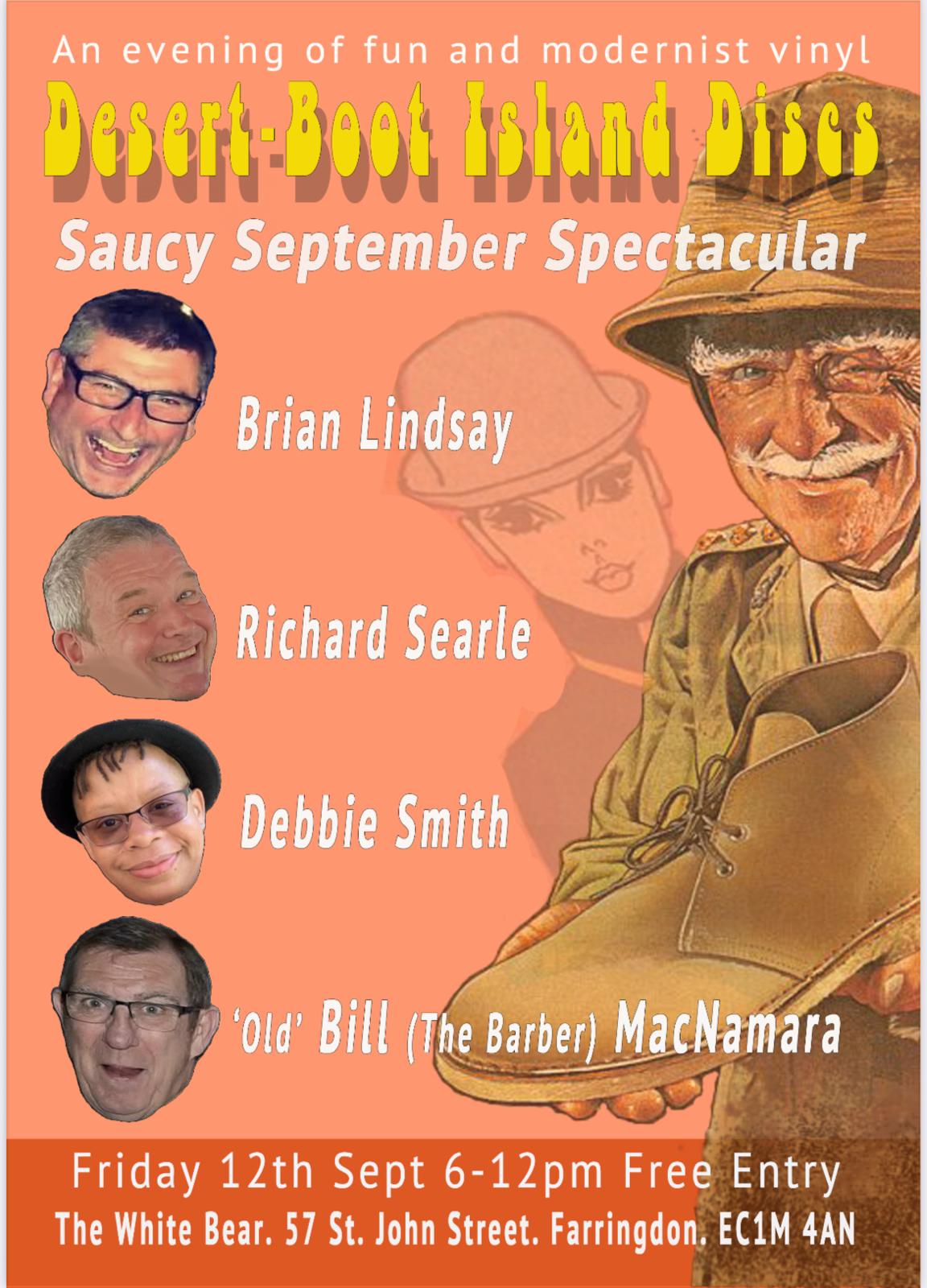 An evening of modernist vinyl selections and good humour with Brian Lindsay, Richard Searle, Debbie Smith and ‘Old’ Bill MacNamara. Expect soul, jazz, funk and plenty of fun. Saucy September Spectacular edition.